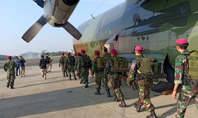 Pemberangkatan pasukan Marinir TNI AL oleh pesawat TNI AU, Senin (6/8/2018)