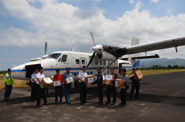 Bantuan berupa bahan makanan dan popok bayi diangkut menggunakan pesawat Twin Otter-300 dari Bandara Ngurah Rai, Denpasar, Bali, Jumat pagi (17/8). Bantuan diserahkan oleh Kasubdit Dukungan Udara Maritim Bakamla RI Kolonel (Sus) Aries Yudho Nugroho kepada Kasi Ops Kamla Bakamla RI Mayor Laut (T) Puadi Hasani, S.T., yang telah berada di Lombok sejak beberapa waktu lalu bersama tim Satgas Bakamla RI lainnya, di Bandara Sela Parang, dengan disaksikan Mayor Laut (P) Susilo Nugroho, tim Satgas Bakamla RI serta personel Stasiun Pemantau Keamanan dan Keselamatan Laut (SPKKL) Bali.