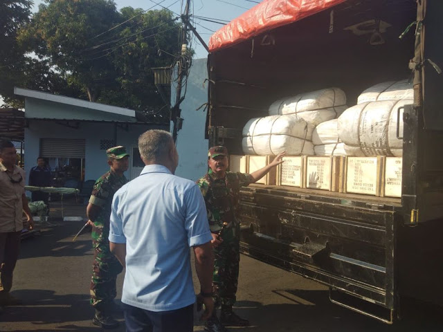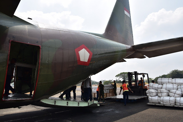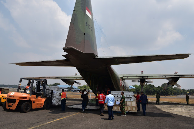 Jakarta, Stratak-News | Panglima TNI Marsekal TNI Hadi Tjahjanto, S.I.P. didampingi Komandan Lanud Halim Perdanakusuma Marsma TNI Mohamad Tonny Harjono meninjau langsung pengiriman bantuan dari Tentara Nasional Indonesia untuk korban gempa bumi Lombok, Nusa Tenggara Barat, bertempat di Gedung Suma 3, VIP Room Lanud Halim Perdana Kusuma, Jakarta Timur, Senin (20/8/2018).   Bantuan sebanyak 9,8 ton dari TNI, terdiri dari 55 tenda lapangan dan obat-obatan diangkut menggunakan Pesawat Hercules C-130 A-1312 dibawah pimpinan Pilot Mayor Pnb Fandi Abdilah dan Co Pilot Lettu Pnb Gustin Rossyan.