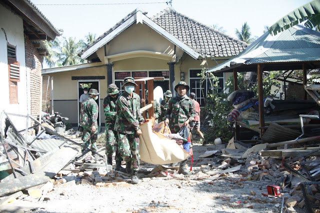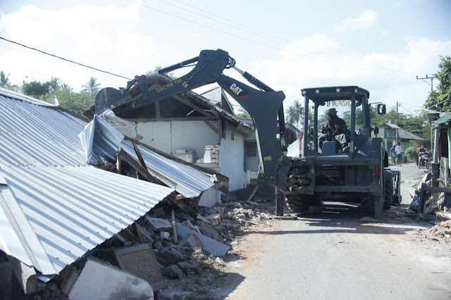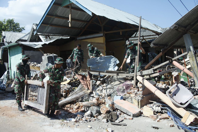 Jakart, Stratak-News | Prajurit TNI Batalyon Zipur 10 Kostrad terus menyisir dan membersihkan reruntuhan rumah warga akibat gempa bumi beberapa waktu lalu di Kecamatan Kayangan, Lombok Utara, Kamis (16/8/2018).