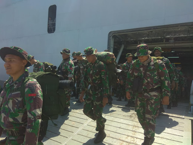 “Selain membawa 173 Prajurit TNI dari Yon Zikon 13/KE dan Yonzikon 14/Serada Wira Camertita, kapal KRI TNI AL juga membawa material berupa kendaraan angkut berat, sepertidumptruck, crane cargo, selfloader, backhoe loader, dozer dan forklift,” ujarnya.